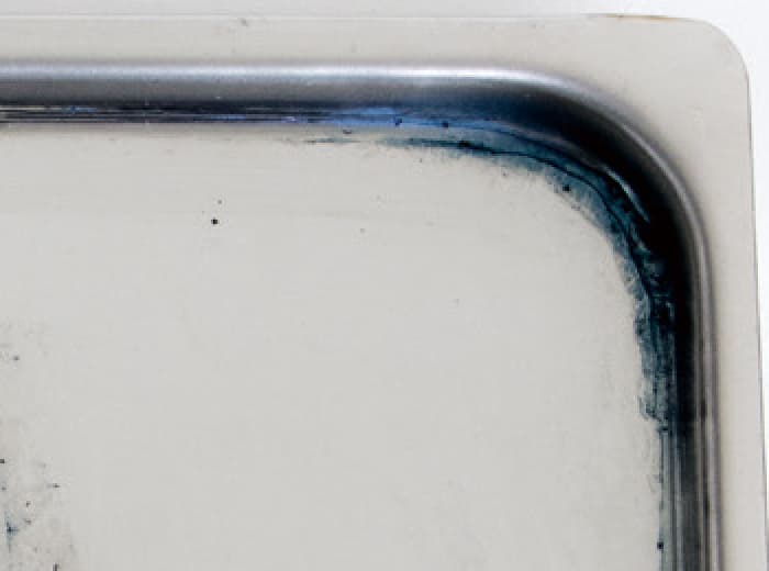 専用の染色液*を使用すると、洗い残しがあることがわかります。*血液などのタンパク質に反応し、染色反応(写真の様に青く染色します)を示す試薬
