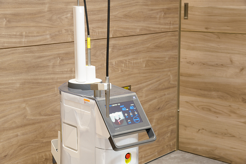 当院は、粘膜も虫歯も治療することができる歯科用Er:YAGレーザー(Erwin Adverl SH)を導入しています。痛みをあたえない歯科治療のために、水を含んだ生体組織に対する蒸散能力が高く、表層にのみ反応が起こり、熱の発生が微小なため、痛みが少ないという特徴を持つ、人にやさしいレーザーです。