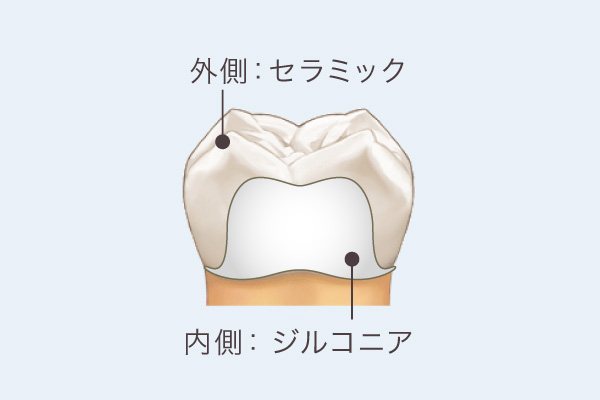 強度の高さから人工ダイヤモンドとも言われる「ジルコニア」を内側に使用し、外側を審美性の高いセラミックで覆った被せ物です(ジルコニアのみの被せ物もあります)。異なる素材の特性を生かしており、耐久性・審美性の両方に優れています。金属不使用のため、金属アレルギーの発症や歯ぐきの変色が起きる心配もありません。