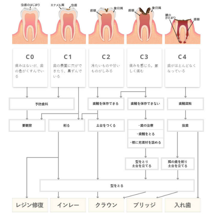 虫歯は削り、詰め物や被せ物をすることできれいになりますが、一度削ってしまった歯はもとの「天然の歯」に戻ることはなく、原因を解決しない限り再発を繰り返します。虫歯になる度に歯を削って…と繰り返す悪循環にはまると、どんどん天然の歯が少なくなり、残った歯の寿命も短くなってしまいます。