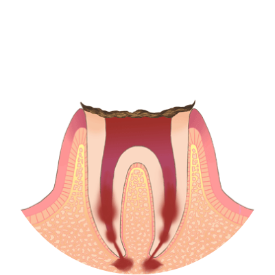 - 根の先に細菌と膿がたまって炎症が起き、硬いものを噛んだりすると痛みや違和感を感じるようになります。まれではありますが、そこから全身に細菌が侵入する危険性もあります。まずは虫歯の予防を心がけ、なってしまったら早期に発見・治療を行いましょう。