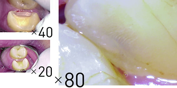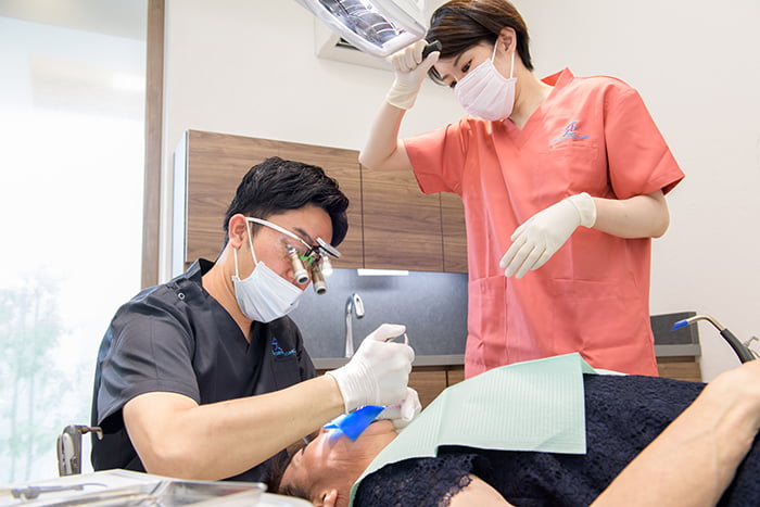 ドクターが目につけている双眼鏡のようなものは拡大鏡です。「明るく」「拡大された視野」を確保でき、細かい部分まで確実に治療をすることができます。歯を削る量を最小限にし、痛みなく、スピーディーに、そして精度よくきれいに治療を行うことができます。