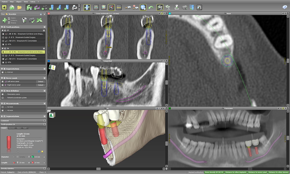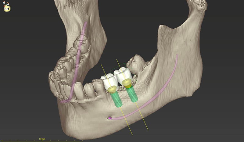 インプラント治療を行う上で最も大切なこと、それは「診断」です。CTやシュミレーションソフトを用いて事前に「骨の形態」「血管の位置」などを正確に把握し、適切な診査・診断を行うことで、安心安全なインプラント埋入位置を正確に決定することが出来ます。このようにインプラントによって出来上がる歯の位置を中心に治療計画を立てて治療を進めることを "トップダウントリートメント" といいます。